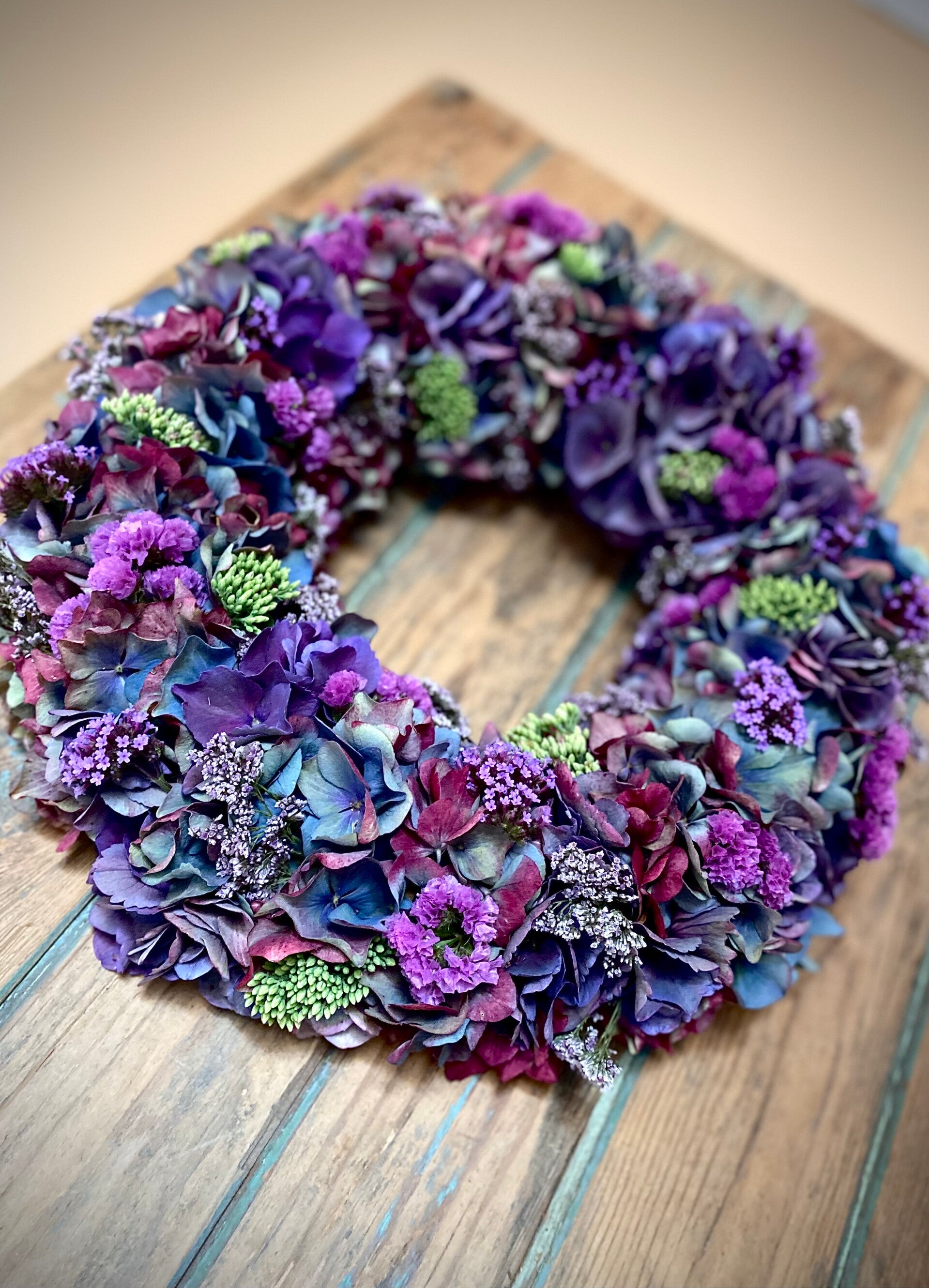 Prachtige handgemaakte krans van hortensia en andere bloemen, Ø 35 cm.