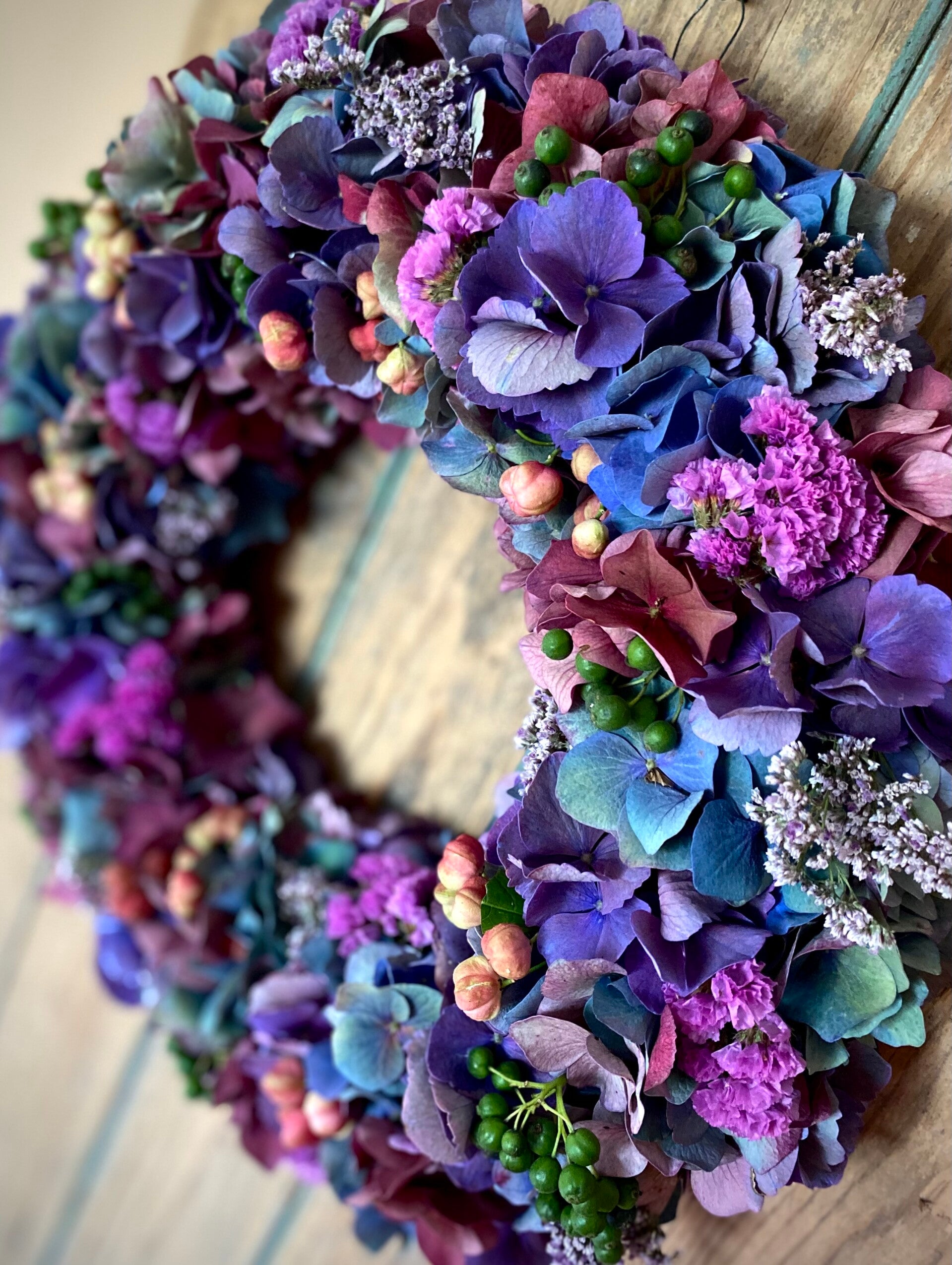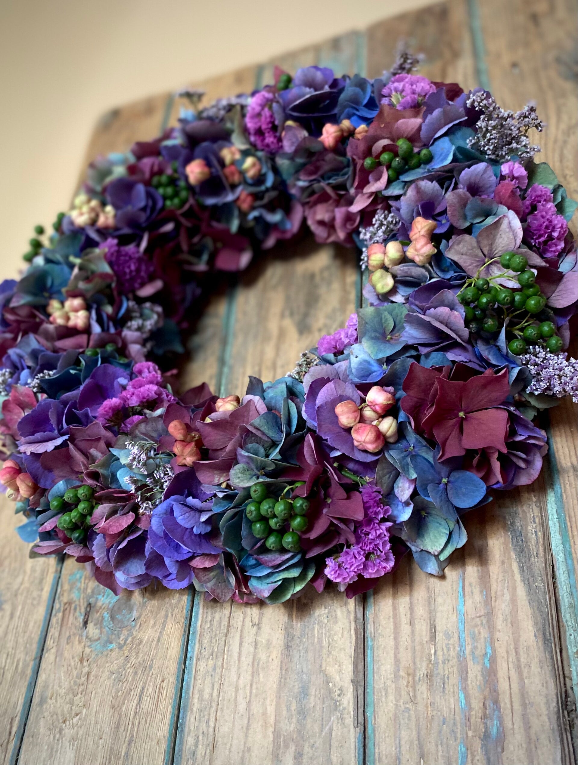 Prachtige handgemaakte krans van hortensia en andere bloemen, Ø 35 cm.